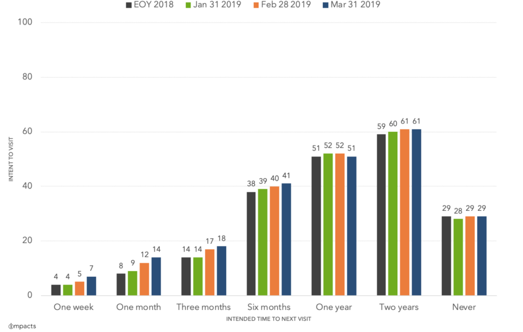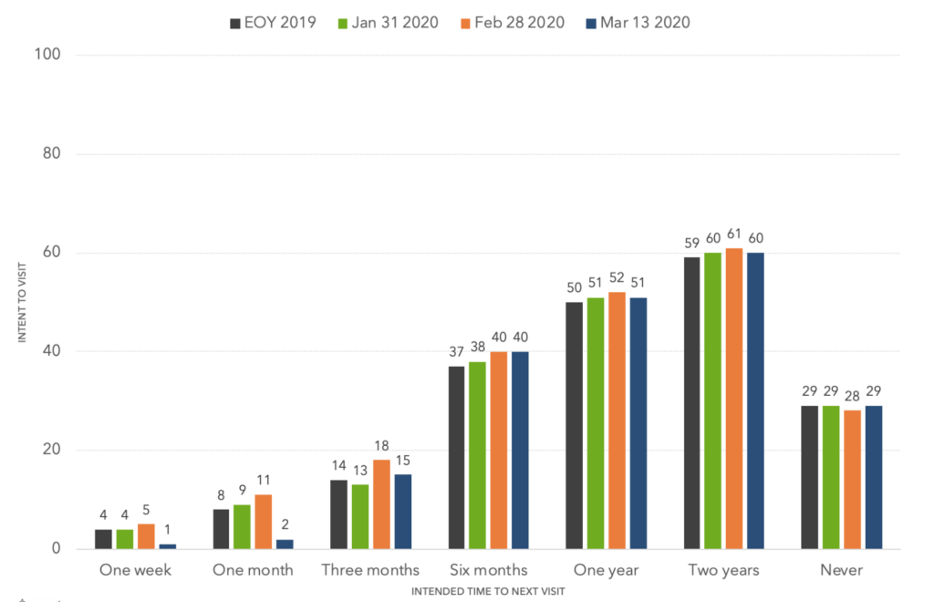 Avec l’expansion de la pandémie et les mesures de plus en plus restrictives prises par les différents États, les intentions de visite ont rapidement décru (regardez la barre bleue). Le graphique ci-dessous a été réalisé auprès d’une audience américaine (comprendre étatsunienne) habituée des musées, parcs zoologiques et centres de culture scientifique.