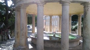 Vue sur les cimes des “terrasses d’argent” du Château (datant des 16ème-17ème siècles) et l’ancien lavoir de style néoclassique du village de Grignan, à la ressemblance des temples ronds de l’Antiquité et inspiré du temple de l’Amour du petit Trianon à Versailles (Crédits photos: Alexandre Plateaux).