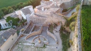 Vue de la scène théâtrale située dans la cour d’honneur et vue plongeante vers l’abbatiale Saint-Sauveur, en partie détruite lors des guerres de Religion et comprenant les tombeaux de Madame de Sévigné ainsi que celui des Adhémar, situés dans la crypte du chœur (Crédits photos: Alexandre Plateaux).